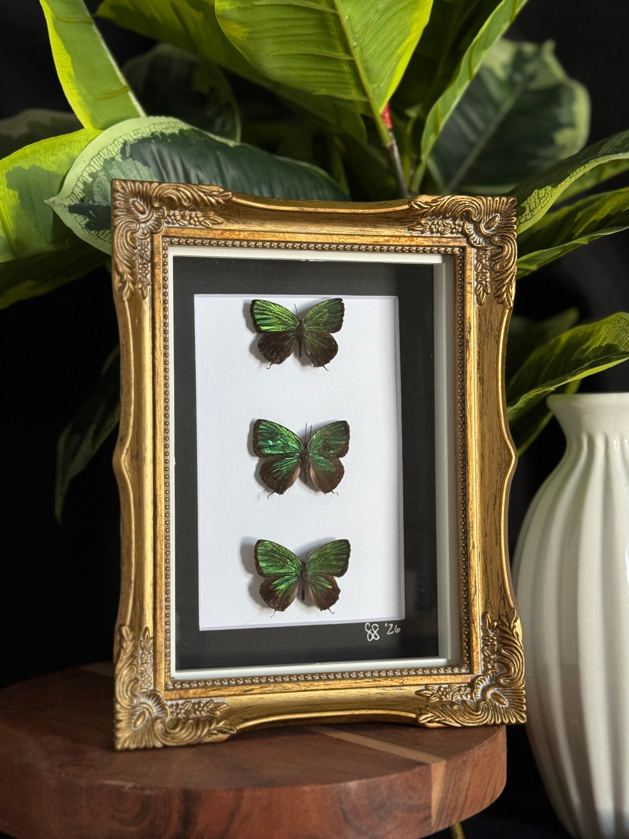 5x7 gold ornate frame featuring three stunning metallic green butterflies